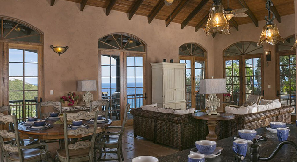 The gourmet kitchen also features ocean views, granite, stainless steel appliances and is fully stocked with cooking utensils to insure you will have every thing you need to cook your favorite meal. Just off the kitchen is the great room with 18 ft vaulted tongue and groove cypress cielings and the Caribbean Sea beyond. Lounge in the great room and enjoy the view over Fish Bay and Rendezvous Bay through the many 10 ft French doors that wrap the great room on two sides.