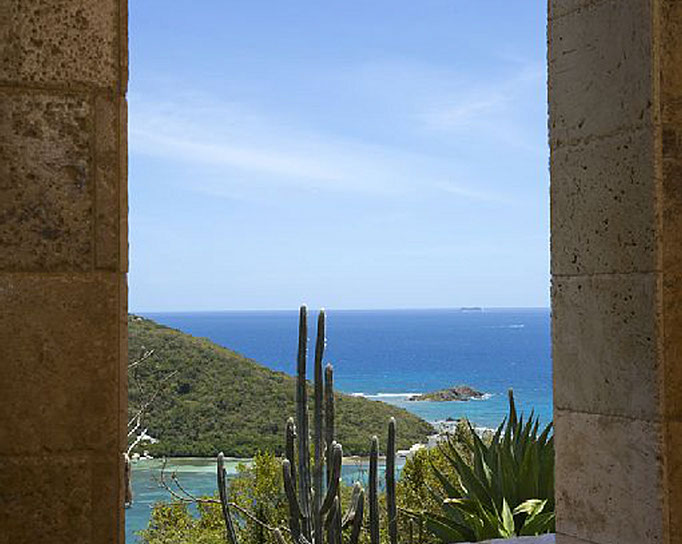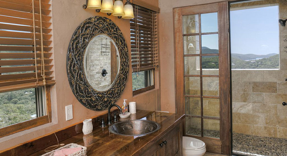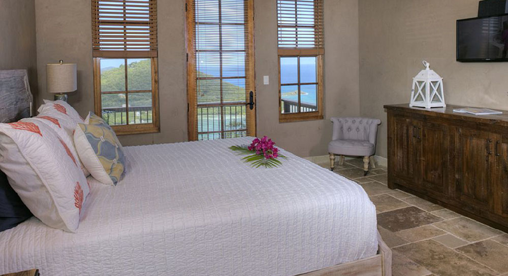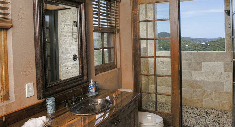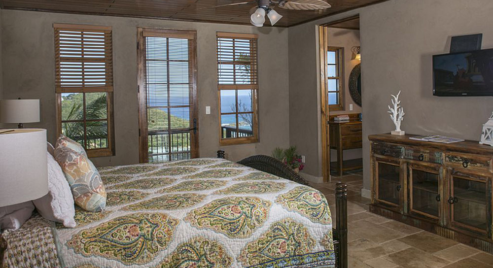 Outdoors, Caribbean Palm Villa is professionally landscaped with multiple natural stone out croppings with native cactus mixed in to add to the appeal of this villa. Beyond the tremendous rock out croppings is beautiful Fish Bay and the Caribbean Sea beyond. Caribbean Palm Villa also features native stone walls throughout the entrance and the veranda.