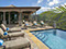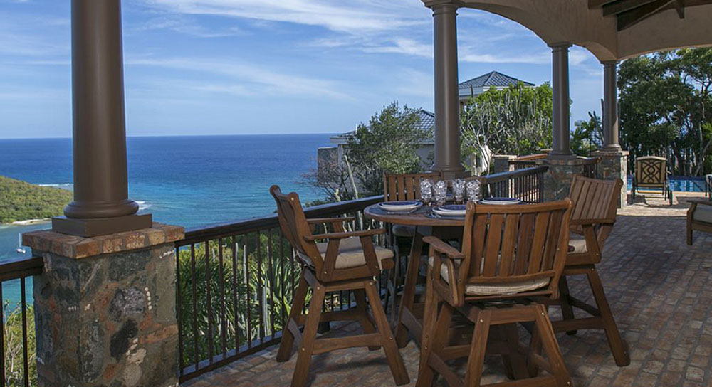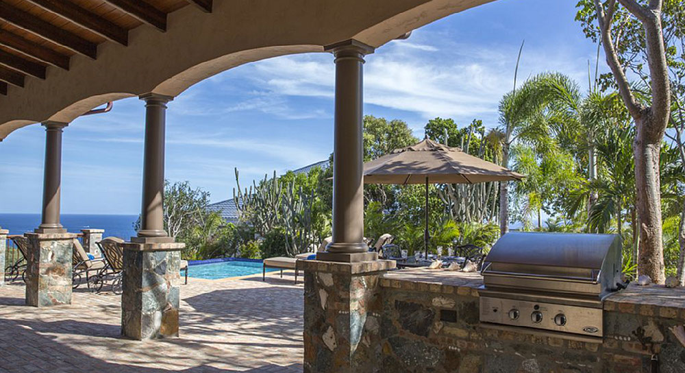 The 750 sq ft of covered veranda with constant 24/7 trade wind breezes and 3 bay view, is a simple one step down from the great room. The pool and the 800 sq ft pool patio for sunning and relaxing finished with genuine Chicago Pavers, is just one step down from the covered veranda. The covered veranda which wraps the villa on 2 1/2 sides allows you to enjoy the 270 degree views with out the sun or rain forcing you indoors. There is a built in grill, set in the native island stone work, located on the veranda close to the kitchen and the pool.